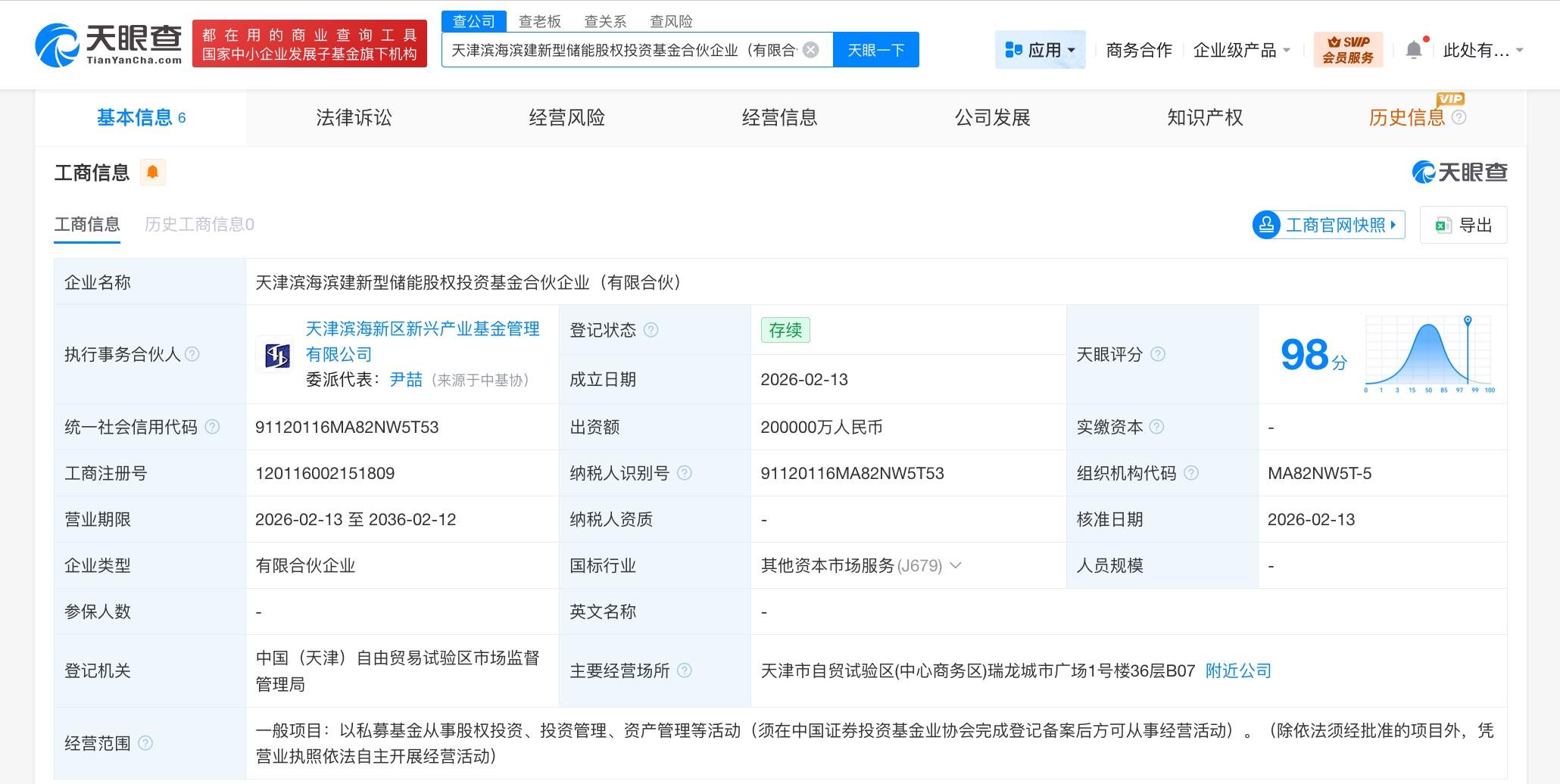 天眼查App显示,近日,天津滨海滨建新型储能股权投资基金合伙企业(有限合伙)成立,执行事务合伙人为天津滨海新区新兴产业基金管理有限公司,出资额20亿人民币,经营范围为以私募基金从事股权投资、投资管理、资产管理等活动。