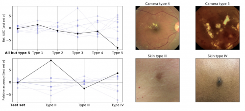 压力测试中医学影像模型的相对可变性。左上角:当对来自不同相机类型的图像进行评估时,使用不同随机种子训练的糖尿病视网膜病变分类模型之间的 AUC变化。在这个实验中,在训练过程中没有遇到相机类型 5。左下角:在对不同估计皮肤类型进行评估时,使用不同随机种子训练的皮肤状况分类模型之间的准确性差异(由皮肤科医生培训的非专业人士从回顾性照片中得出的近似值,并可能受到标签错误的影响)。右:来自原始测试集(左)和压力测试集(右)的示例图像)。