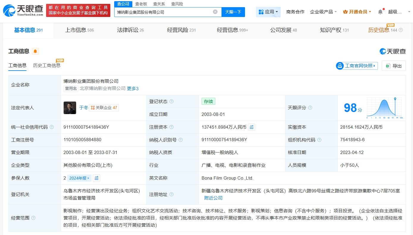 博纳影业集团股份有限公司成立于2003年8月,法定代表人为于冬,注册资本约13.75亿人民币,经营范围包括影视制作、经营演出及经纪业务、组织文化艺术交流活动等。股东信息显示,该公司由于冬、浙江东阳大麦娱乐有限公司、林芝腾讯科技有限公司等共同持股。