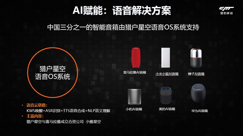 此外,猎户星空的语音OS技术也广泛赋能给华为AI智能音箱、喜马拉雅小雅音箱、美的小美音箱等,平台每天线上语音指令超过3000万次,拥有约500万小时的远场语音数据积累,累计激活设备超过2亿,占据了超过30%的中国智能音箱产品市场份额。