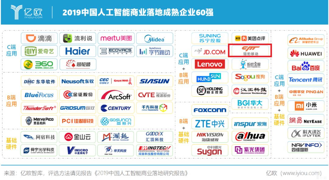 在"人工智能商业落地成熟企业60强榜单"中,亿欧智库对其中业务相对成熟、营收规模较大的企业进行梳理盘点,并根据企业的业务属性进行分类。猎豹移动以其在C端与B端的应用落地实力入围。