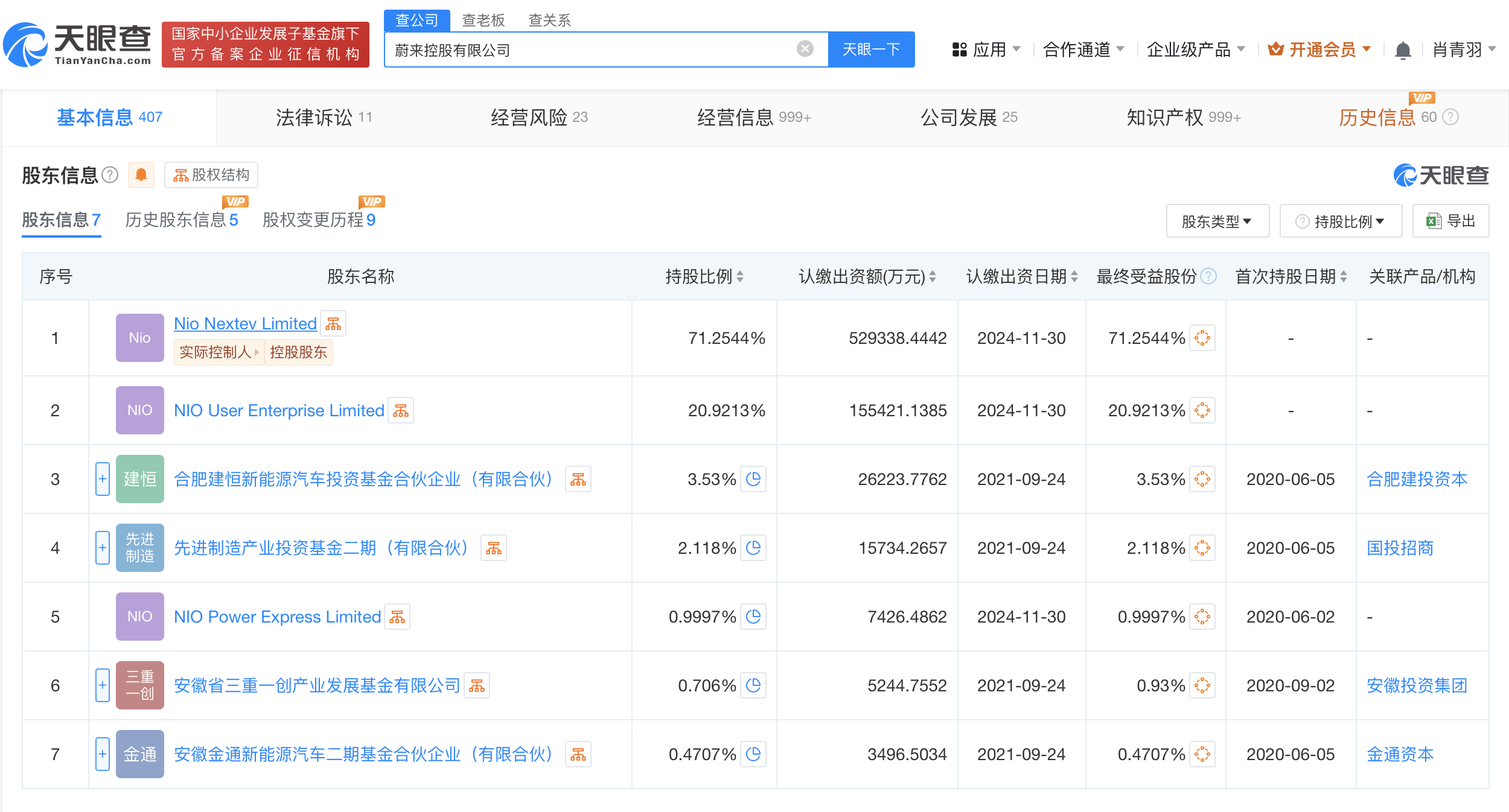 蔚来控股有限公司成立于2017年11月,法定代表人为李斌,经营范围含新能源汽车整车及相关零部件的技术开发、技术服务、技术转让和技术咨询等。股东信息显示,该公司由Nio Nextev Limited、NIO User Enterprise Limited、合肥建恒新能源汽车投资基金合伙企业(有限合伙)等共同持股。