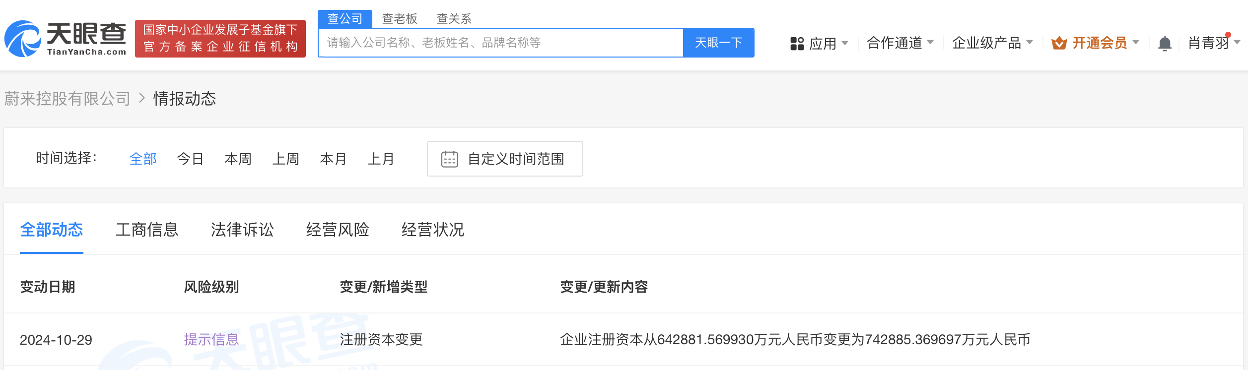 天眼查App显示,近日,蔚来控股有限公司发生工商变更,注册资本由约64.3亿人民币增至约74.3亿人民币。