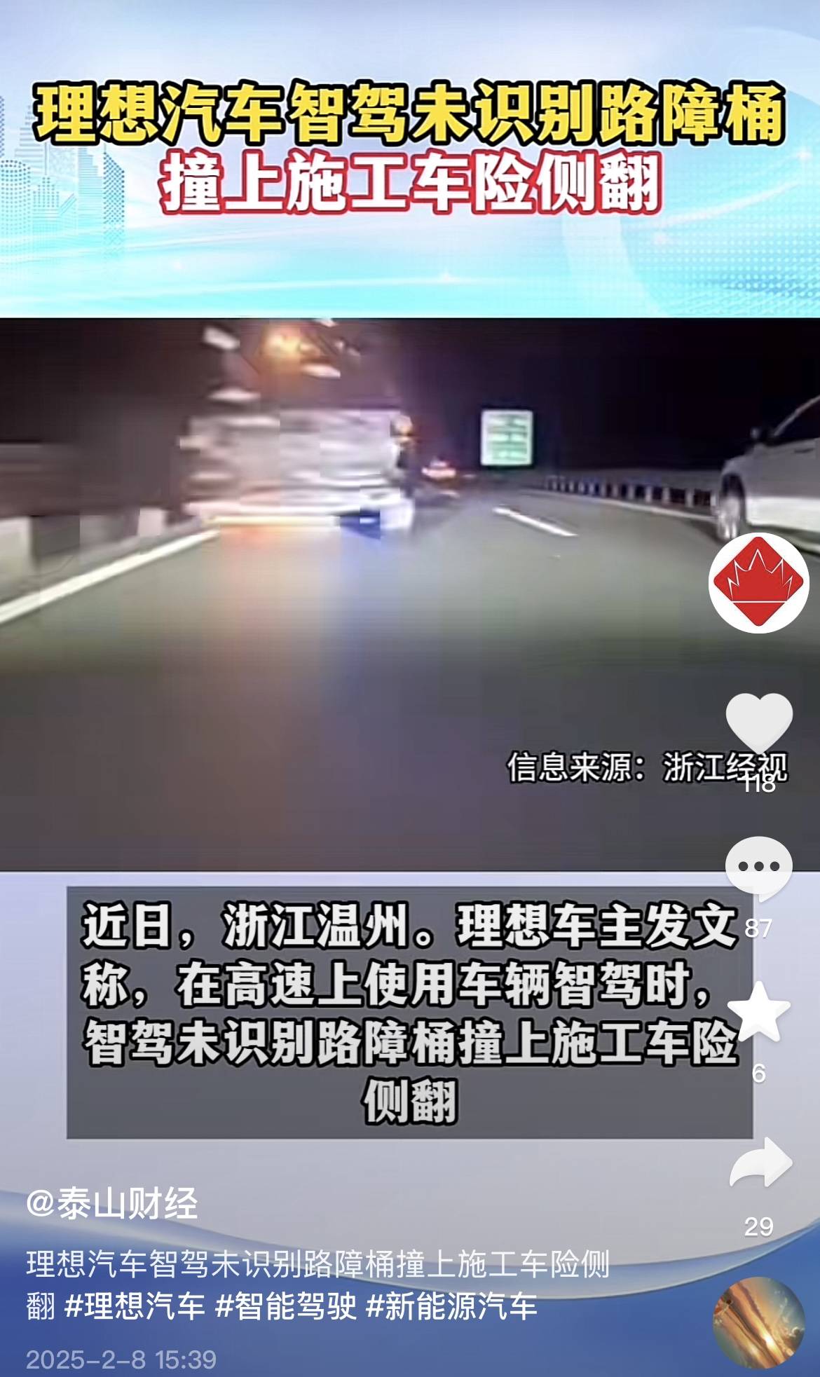 理想汽车智驾未识别路障桶 撞上施工车险侧翻快讯