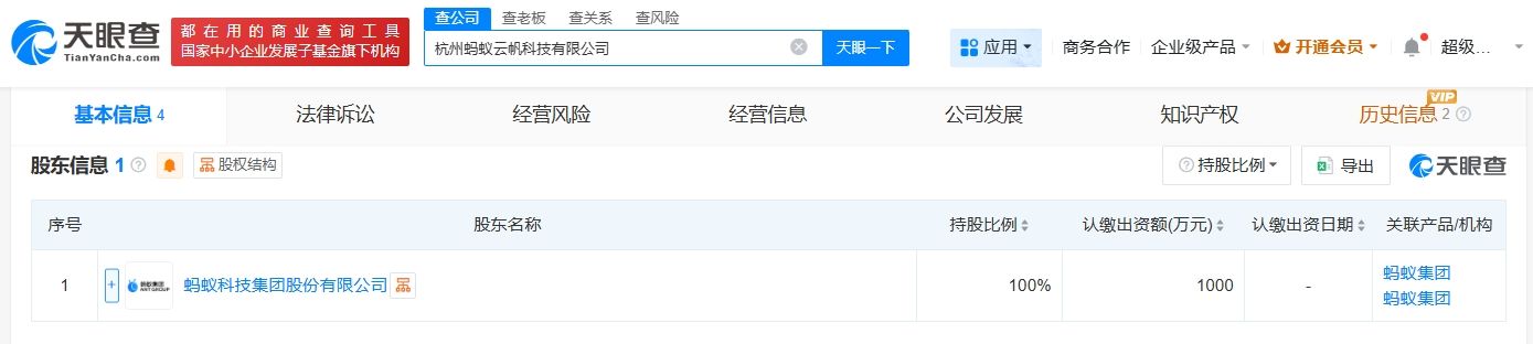 蚂蚁集团在杭州成立云帆科技公司 注册资本1000万观点