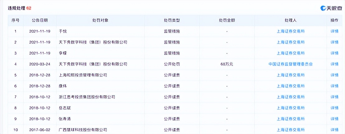 但紧接着上交所便对天下秀及时任董事长李檬、时任董事会秘书于悦予以了监管警示,认为其信息可能对投资者形成误导。天眼查APP违规处理信息显示,上交所对天下秀及时采取了监管措施。