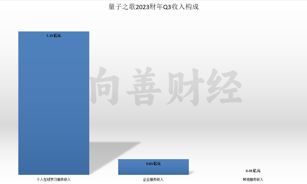 量子之歌的收入分为个人在线学习服务收入、企业服务收入、其他服务收入三类。据2023财年第三季度财报显示,量子之歌的收入个人在线学习服务收入、企业服务收入、其他服务收入分别为7.25亿元、8110万元、140万元。