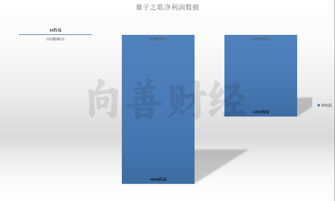 营收来看,虽然环比增长不到3%,但量子之歌仍然保持着增长态势。不过从净利润来看,量子之歌却难掩颓势。在2023财年第三季度,量子之歌净亏损2270万元,相较于2023财年第二季度的4140万元人民币的净亏损,收窄了45.3%。