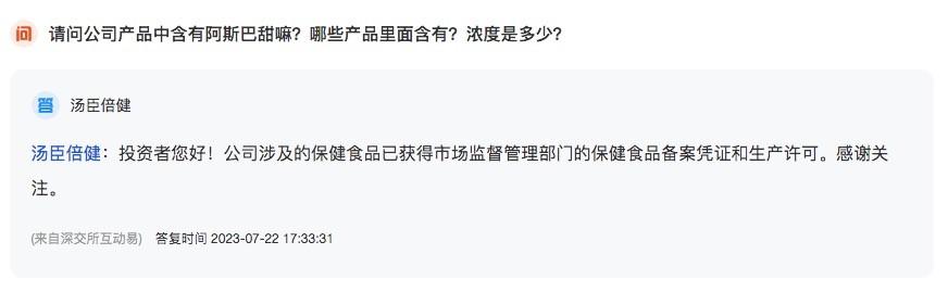 就像是投资交流平台中,汤臣倍健董秘7月22日面对投资者提问,以环顾左右而言他的方式逃避正面回应。不免令人猜测,汤臣倍健为何这么“怕”阿斯巴甜?