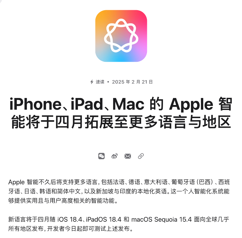 Apple Intelligence(Apple 智能)自推出以来,已经在美国、英国、澳大利亚、加拿大、爱尔兰、新西兰和南非等英语国家上线,此次更新使更多国家和地区的用户能够用母语与Apple Intelligence进行交互。