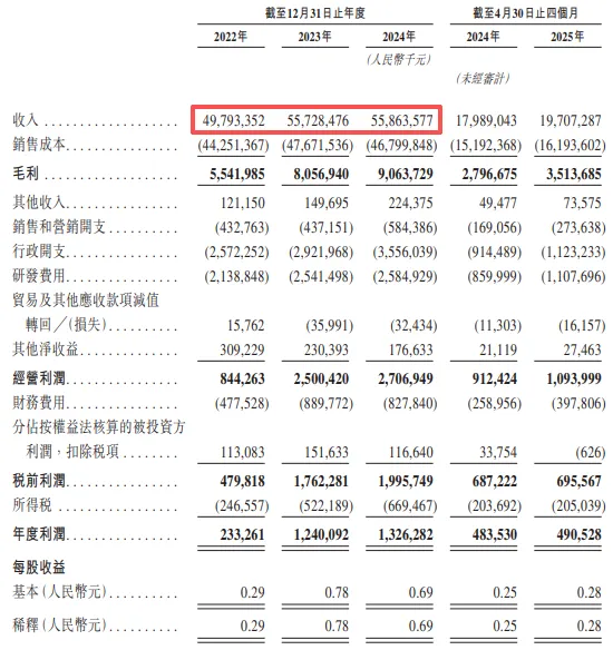 2022年至2024年,营业收入分别为497.93亿元、557.28亿元和558.64亿元,同比增速从9.03%、11.92%大幅下滑至0.24%,三年复合增长率仅5.92%,2024年增长近乎停滞,这样的增长态势对拟上市企业来说,并非利好信号。