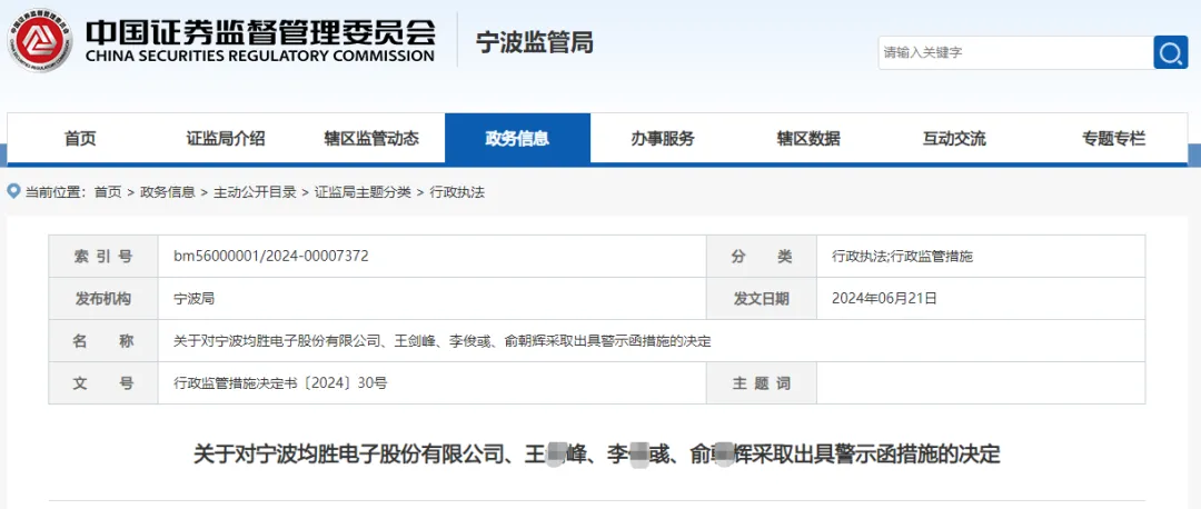 均胜电子的内部控制隐患,正暴露在监管与市场面前。2024年6月,中国证监会宁波监管局《行政监管措施决定书》揭开了其在募集资金使用上的严重违规行为,时任董事长王某峰、财务总监李某彧、董事会秘书俞某辉均被出具警示函,并记入证券期货市场诚信档案。对于一家计划上市的公司,如此明确的监管处罚记录,显然会影响其市场信誉。
