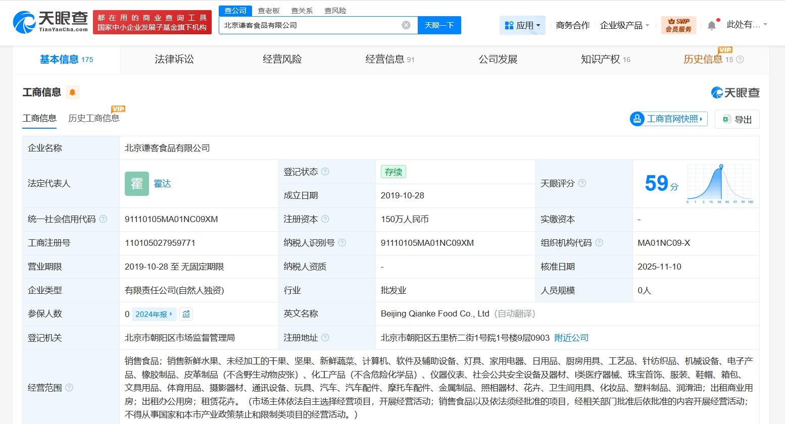 该公司成立于2019年10月,法定代表人为霍达,经营范围含销售食品,销售新鲜水果、未经加工的干果、坚果、新鲜蔬菜,出租商业用房,出租办公用房等。股东信息显示,该公司现由王海全资持股。