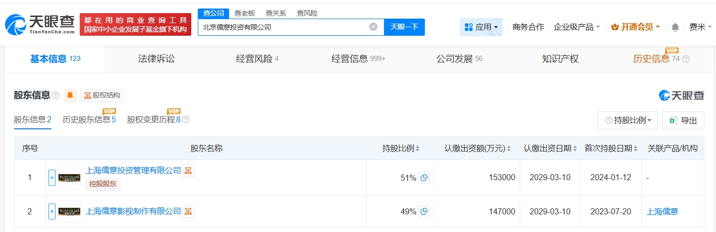 北京儒意投资有限公司成立于2006年12月,法定代表人为柯利明,注册资本30亿人民币,经营范围包括项目投资、投资管理、投资咨询等。股东信息显示,该公司由上海儒意投资管理有限公司、上海儒意影视制作有限公司共同持股。