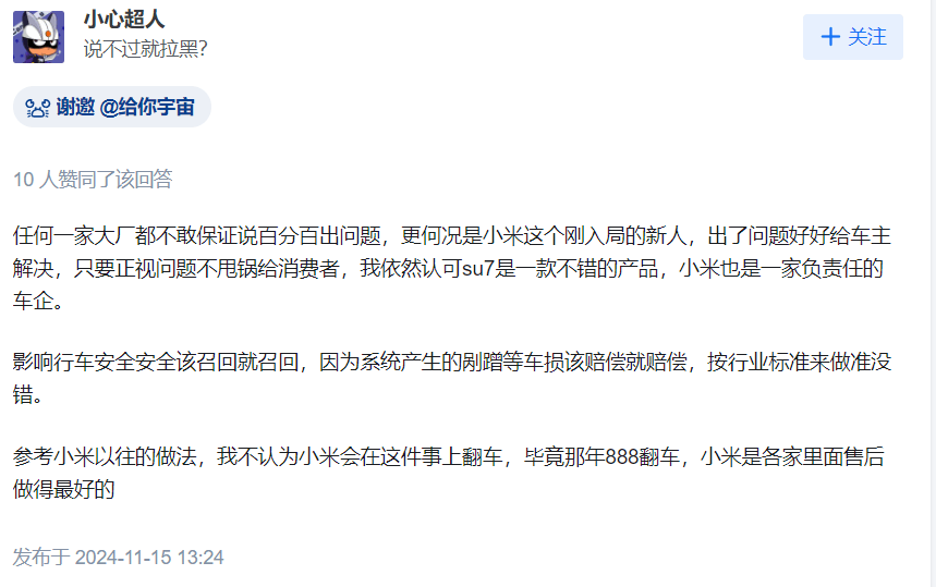 针对11月14日的事故,可以看到有很多网友力挺小米,譬如有网友指出任何一家大厂都不敢保证说百分百出问题,更何况是小米这个刚入局的新人,出了问题好好给车主解决,只要正视问题不甩锅给消费者,其依然认可su7是一款不错的产品,小米也是一家负责任的车企。