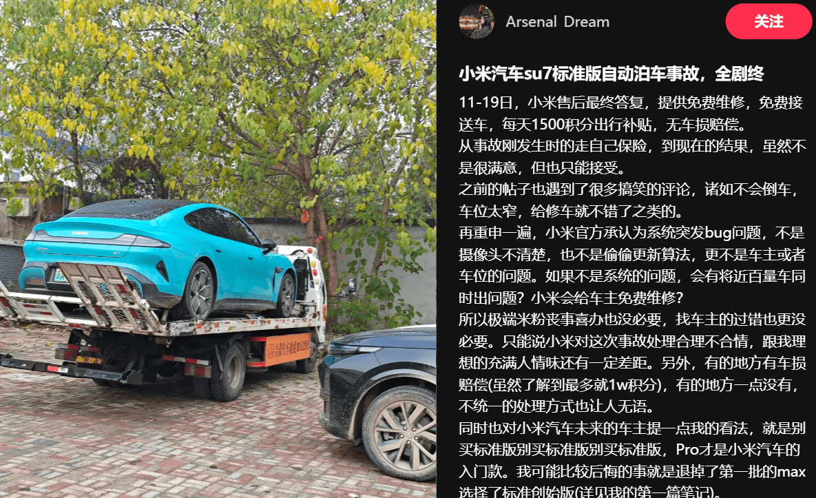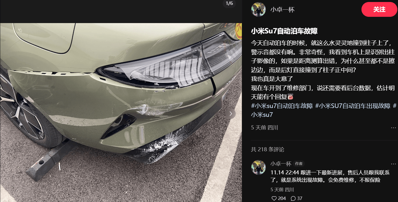 小米SU7自动泊车出现大面积事故?多名车主称11月14日撞车快讯