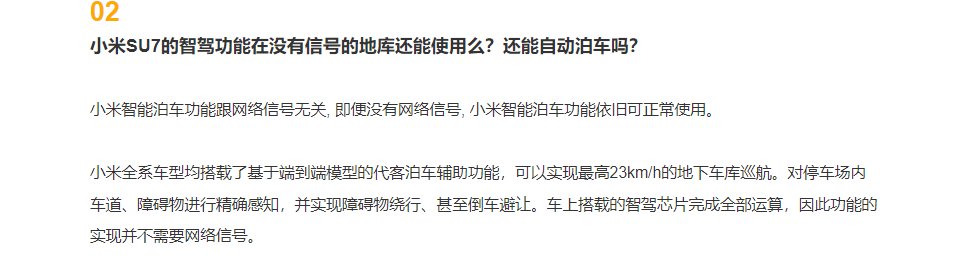 小米全系车型均搭载了基于端到端模型的代客泊车辅助功能,可以实现最高23km/h的地下车库巡航。对停车场内车道、障碍物进行精确感知,并实现障碍物绕行、甚至倒车避让。车上搭载的智驾芯片完成全部运算,因此功能的实现并不需要网络信号。