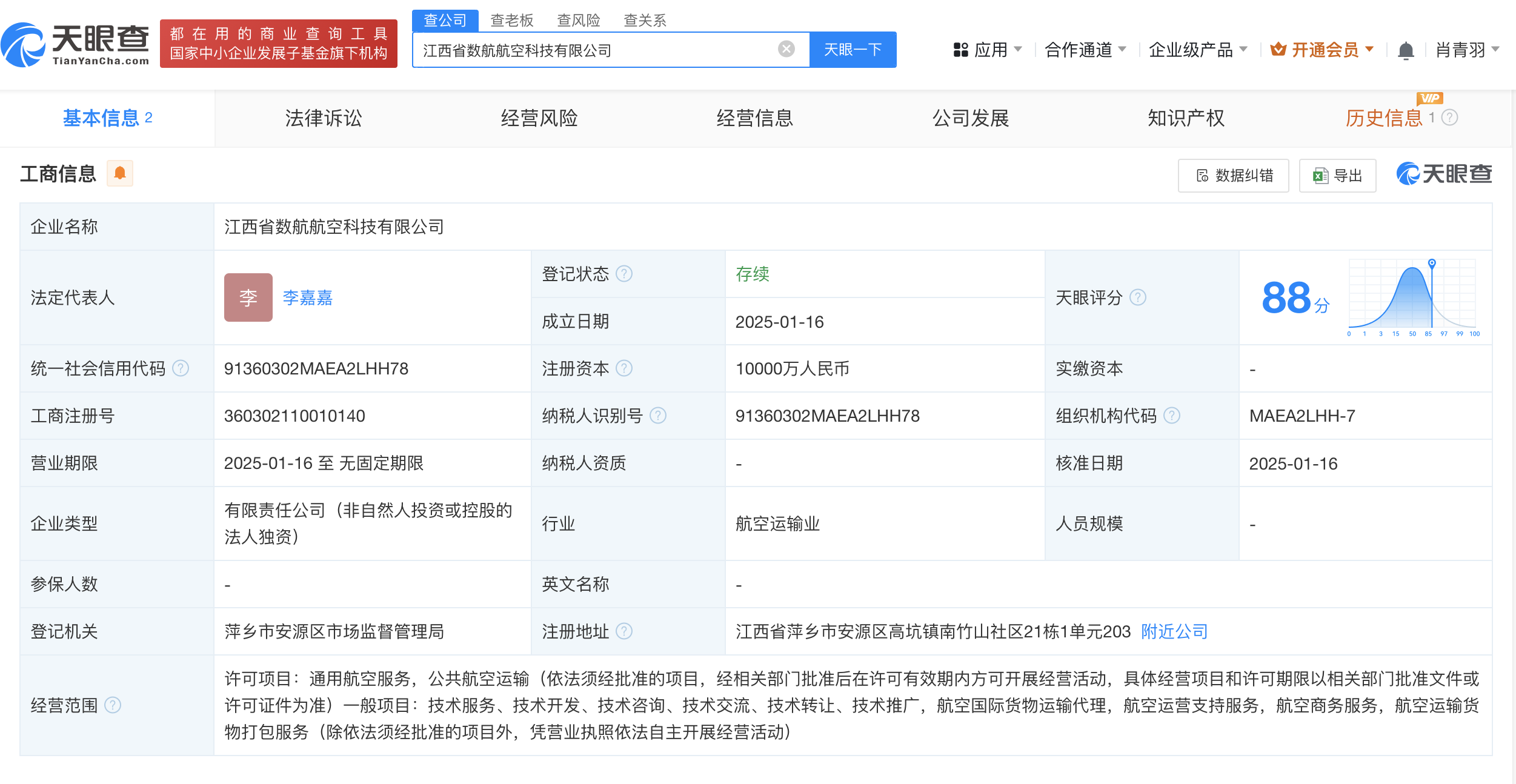 天眼查App显示,近日,江西省数航航空科技有限公司成立,法定代表人为李嘉嘉,注册资本1亿人民币,经营范围含通用航空服务、公共航空运输、航空国际货物运输代理、航空运营支持服务、航空商务服务等。