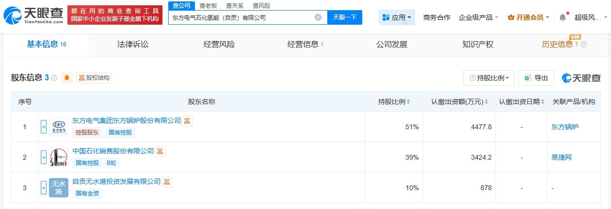 天眼查App显示,近日,东方电气石化氢能(自贡)有限公司成立,法定代表人为张章,注册资本8780万人民币,经营范围包括燃气经营、食品销售、太阳能发电技术服务、新兴能源技术研发、站用加氢及储氢设施销售等。股东信息显示,该公司由东方电气集团东方锅炉股份有限公司、中国石化销售股份有限公司、自贡无水港投资发展有限公司共同持股。