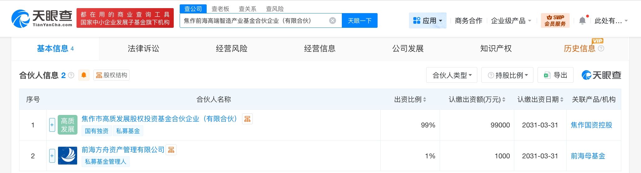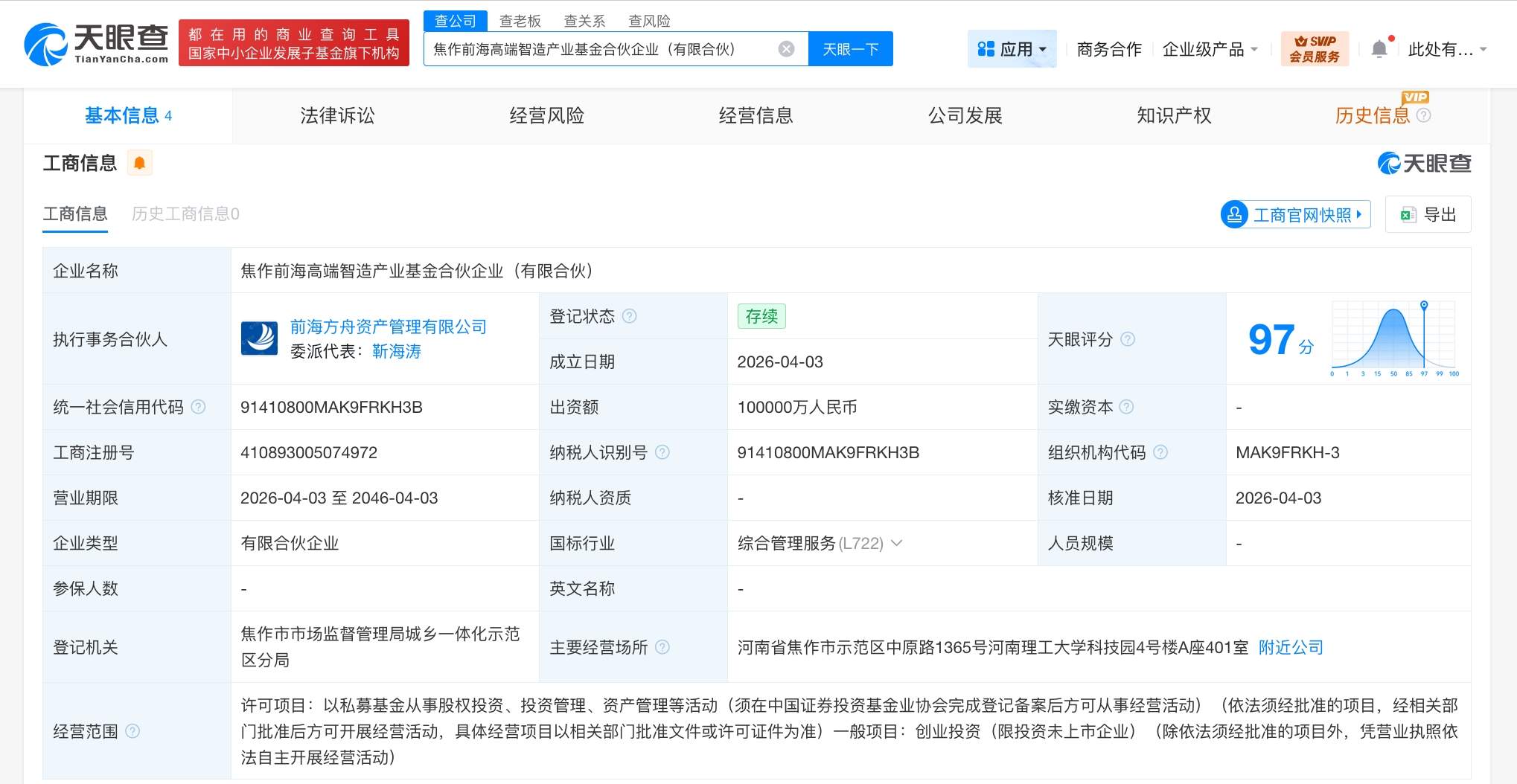 天眼查工商信息显示,近日,焦作前海高端智造产业基金合伙企业(有限合伙)成立,执行事务合伙人为前海方舟资产管理有限公司,出资额10亿人民币,经营范围包括以私募基金从事股权投资、投资管理、资产管理等活动,创业投资。合伙人信息显示,该基金由焦作市高质发展股权投资基金合伙企业(有限合伙)、前海方舟资产管理有限公司共同出资。