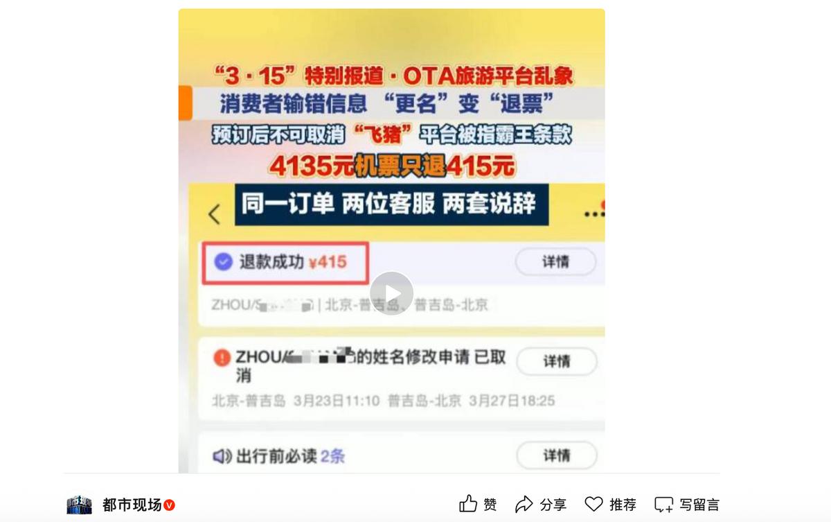 《北京一女士在飞猪预订机票,下单不到1小时取消重买,4000多票款仅退回415元;平台“不可取消”规则被指“隐藏性强”、比航司更严苛》——都市现场