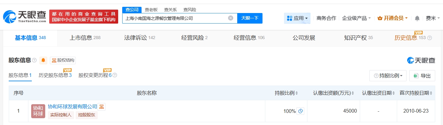 该公司成立于2004年9月,法定代表人为王亮,注册资本4.5亿人民币,经营范围包括餐饮管理、餐饮、仓储服务等,由协和环球发展有限公司全资持股。