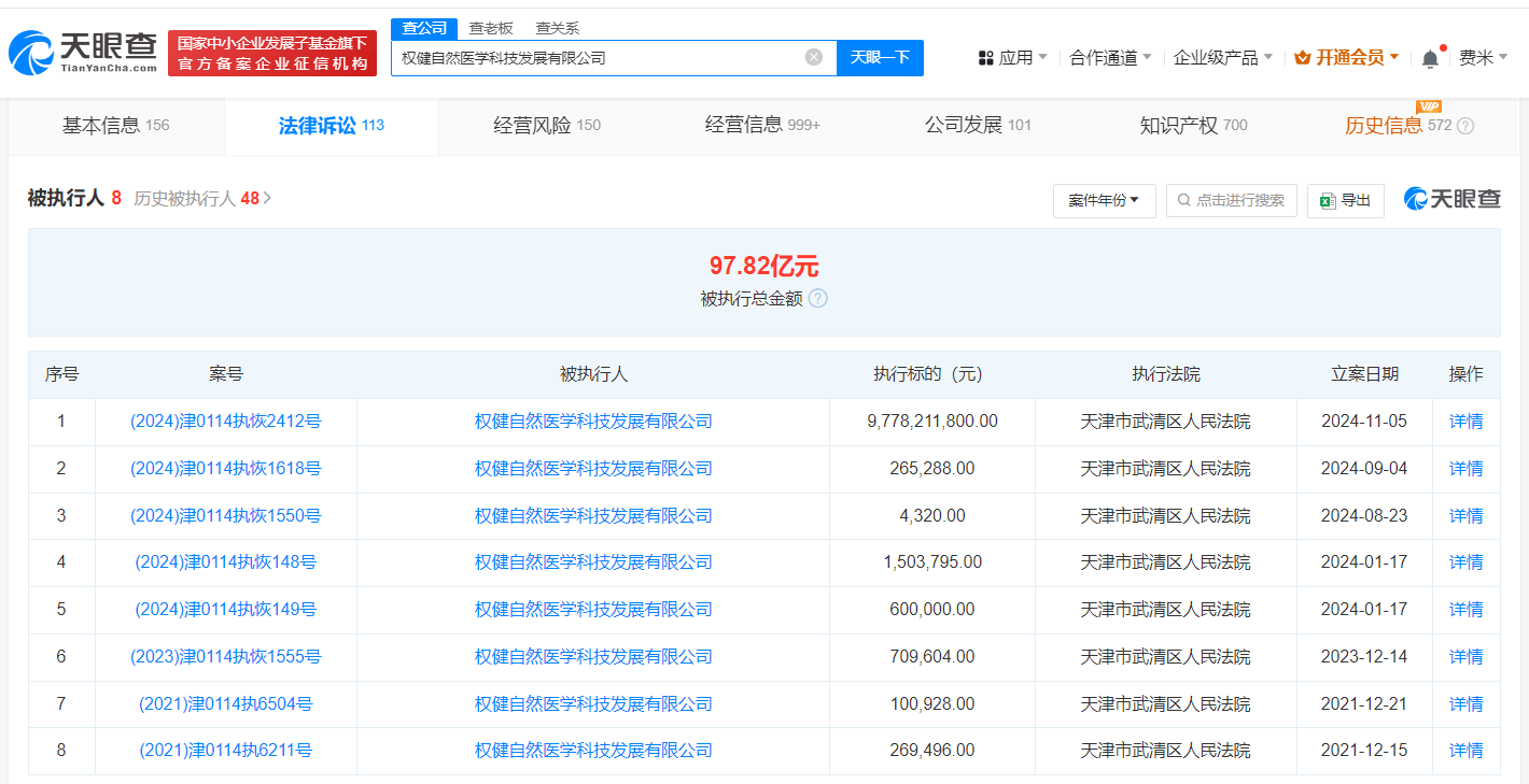 天眼查法律诉讼信息显示,11月5日,权健自然医学科技发展有限公司、孟某等新增一则恢复执行信息,执行标的97.7亿余元,执行法院为天津市武清区人民法院。