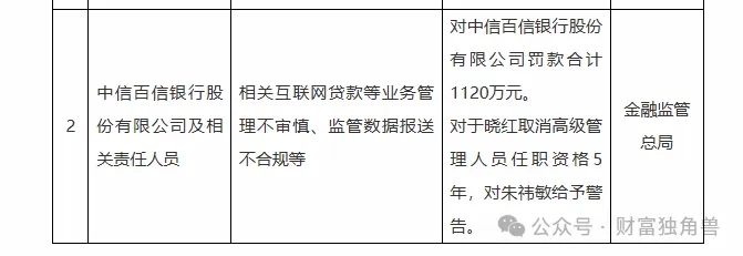 值得一提的是,国家金融监督管理总局2025年9月30日公布的行政处罚信息公示列表显示,中信百信银行因“相关互联网贷款等业务管理不审慎、监管数据报送不合规等”,金融监管总局对其罚款合计1120万元。