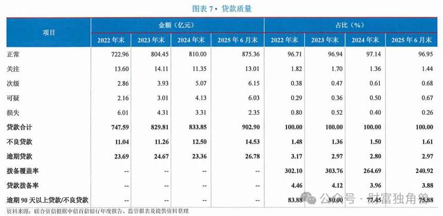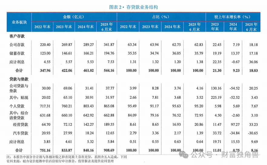 据联合资信信用评级报告,到2024年末,百信银行发放贷款和垫款总额840.16亿元,其中个人贷款803.43亿元,占比95.63%;个人贷款内部,综合消费贷款642.92亿元,占比76.52%,经营贷款142.27亿元,占比16.93%。到2025年6月末,据评级报告数据显示,百信银行发放贷款和垫款总额合计为908.69亿元,其中个人贷款865.08亿元,占比95.20%;综合消费贷款占比72.95%,经营贷款占比20.86%。个人贷款仍占主体,其中综合消费贷款占比下降,经营贷款占比上升。