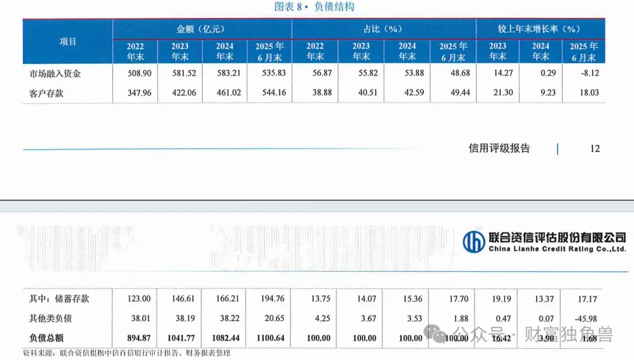 据联合资信信用评级报告,到2024年末,百信银行客户存款461.02亿元,占负债总额42.59%;市场融入资金583.21亿元,占负债总额53.88%。到2025年6月末,客户存款升至544.16亿元,占比49.44%;市场融入资金占比降至48.68%,仍接近一半。