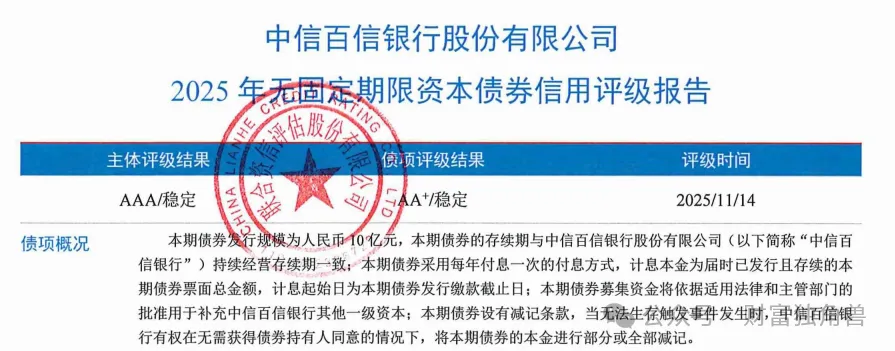 2025年,联合资信披露《中信百信银行股份有限公司2025年无固定期限资本债券信用评级报告》。中信百信银行拟发行规模为人民币10亿元的无固定期限资本债券,具体发行条款以中信百信银行与主承销商共同确定并经主管部门审批通过的内容为准。