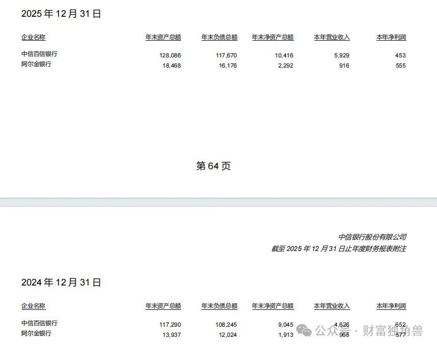若将中信银行2025年半年度报告与2025年年度报告相关数据结合来看,百信银行2025年全年变化更容易呈现全貌。中信银行2025年半年度报告显示,百信银行上半年实现营业净收入28.75亿元,净利润4.72亿元。到年末,营业收入虽继续走高,但净利润却低于上半年水平。