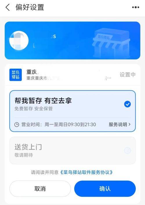 “极点商业”所在小区菜鸟驿站同样未开通该服务,从用户端来看,在菜鸟“收货偏好设置”里,无从选择“送货上门”选项,而是自动被选择“帮我暂存,有空去拿”——所有快递,也就会被自动放入菜鸟驿站中。