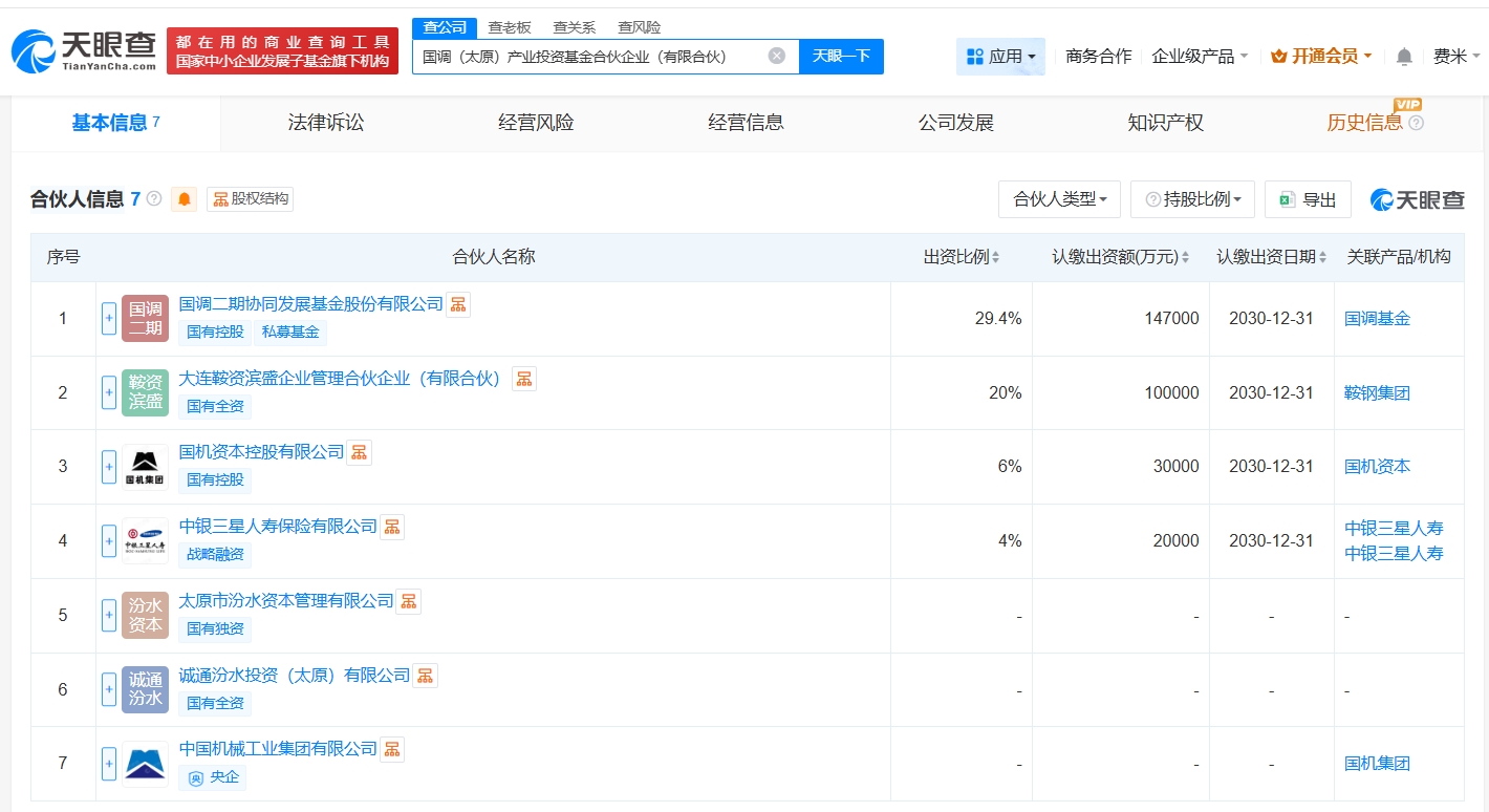 天眼查App显示,近日,国调(太原)产业投资基金合伙企业(有限合伙)成立,执行事务合伙人为诚通汾水投资(太原)有限公司,出资额50亿人民币,经营范围为以私募基金从事股权投资、投资管理、资产管理等活动,由国调二期协同发展基金股份有限公司、鞍钢集团旗下大连鞍资滨盛企业管理合伙企业(有限合伙)、国机资本控股有限公司等共同出资。