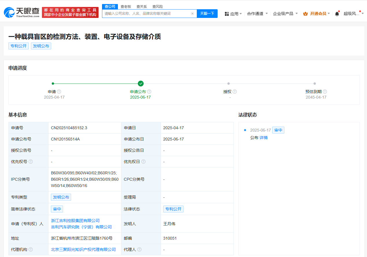 天眼查App显示,6月17日,浙江吉利控股集团有限公司、吉利汽车研究院(宁波)有限公司申请的“一种载具盲区的检测方法、装置、电子设备及存储介质”专利公布。