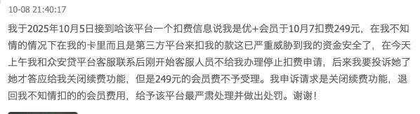 根据不同人的投诉,扣除会员费的标准也不尽相同。10月8日有用户投诉,“我于2025年10月5日接到哈该平台一个扣费信息,说我是优+会员于10月7扣费249元,在我不知情的情况下在我的卡里而且是第三方平台来扣我的款,在今天上午我和众安贷平台客服联系后,刚开始客服人员不给我办理停止扣费申请,后来我要投诉她了她才答应给我关闭续费功能,但是249元的会员费不予受理。”