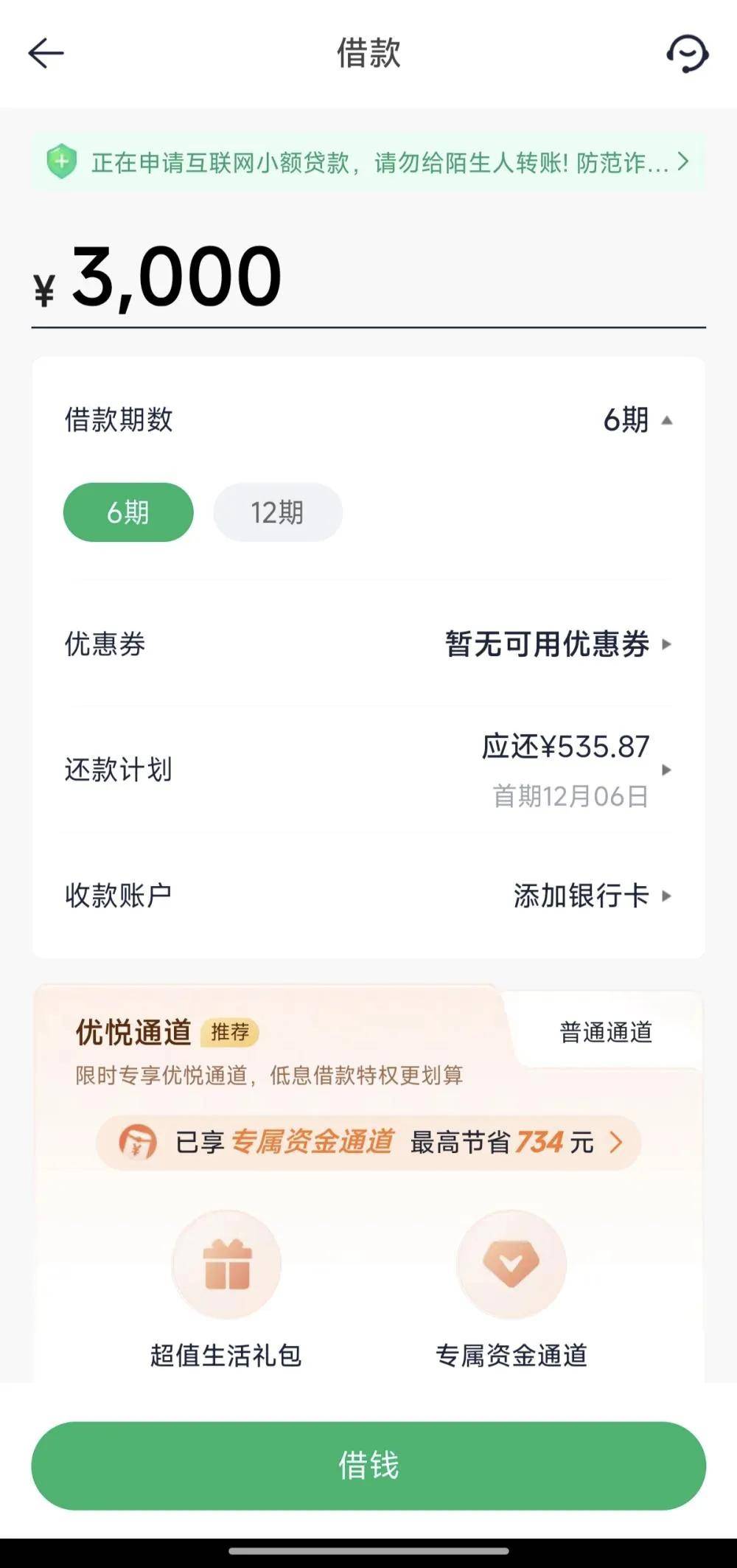 以小编的实测为例,借款3000元分6期还款,若通过“优悦通道”借款,在加入每月199元的会员费后,还款计划为前五期每期均为734.87元,第六期为734.86元,合计应还总额为4409.21元,按照IRR公式计算,小编承担的年化成本高达147%。