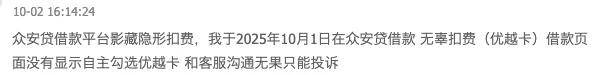 对于这个优悦卡,一名于2025年10月1日借款的借款人也直接指出,“众安贷借款无辜扣费(优越卡),借款页面没有显示自主勾选优越卡”。