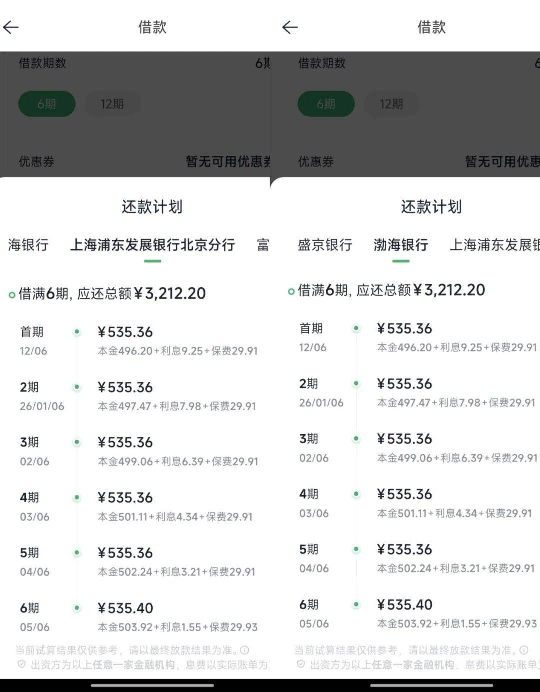 还款计划显示,借款3000元,分6期还,通过振兴银行和江苏银行借款不收取保费,但利息要高,还款总额分别为3215.21元和3213.47元,利息总额分别为215.21元和213.47元。南京银行、浦发银行北京分行和渤海银行的总还款额均为3212.2元,6期的利息总和分别为30.95元、32.72元和32.72元,相应6期保费总和分别为181.25元、179.48元和179.48元,保费总额分别是利息总额的约5.9倍、5.5倍和5.5倍。