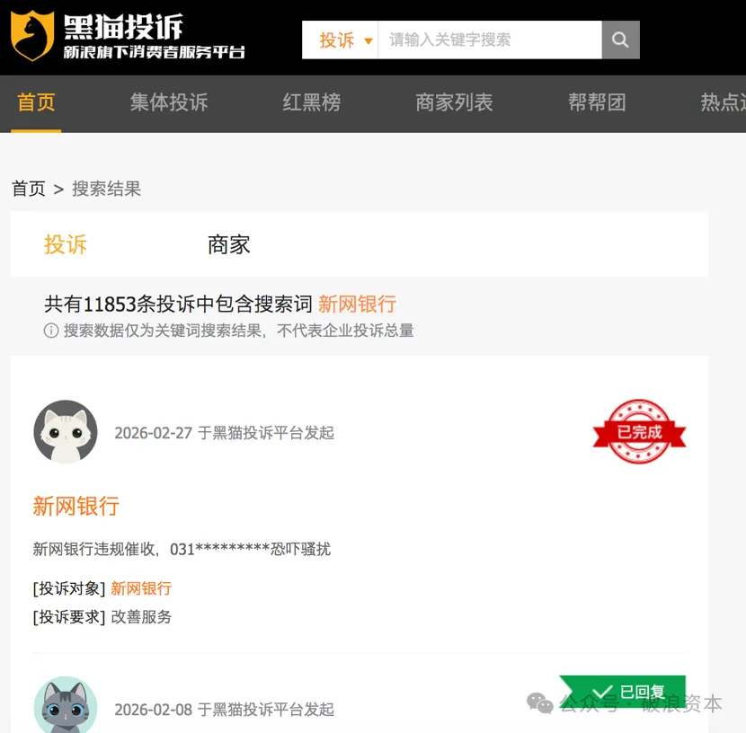 截至目前,黑猫投诉平台上针对新网银行的投诉量已突破11000条,投诉焦点高度集中,暴力催收、利率不透明、违规扣款、协商还款难四大问题,构成了新网银行漠视消费者权益的真实写照。