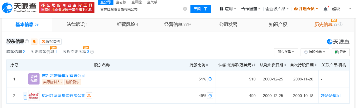 吉林娃哈哈食品有限公司成立于2000年10月,注册资本1000万美元,经营范围包括食品生产、食品用塑料包装容器工具制品生产,由塞舌尔盛佳集团有限公司、杭州娃哈哈集团有限公司共同持股。