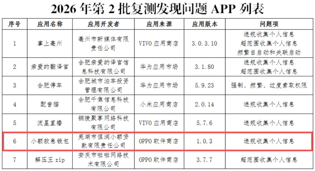 其中,芜湖市恒润小额贷款有限责任公司(以下简称“恒润小贷”)旗下小额救急钱包因违规收集个人信息遭通报。