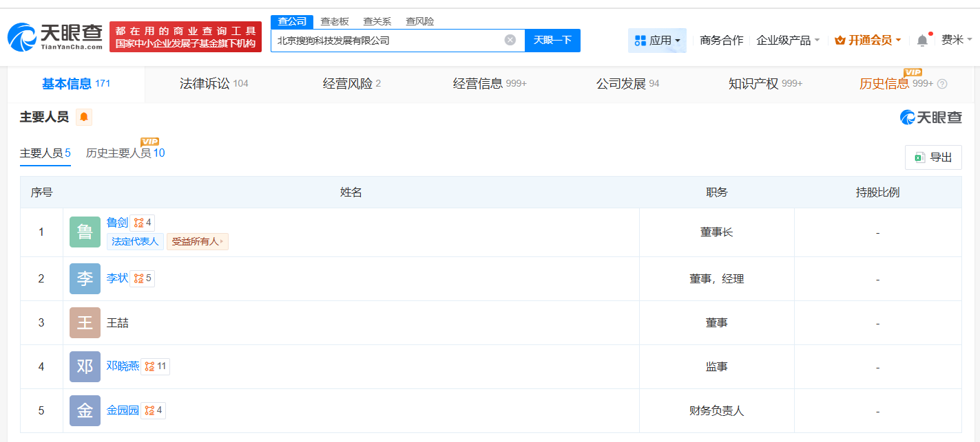 天眼查App显示,近日,北京搜狗科技发展有限公司发生工商变更,叶骏卸任法定代表人、董事长,由鲁剑接任。