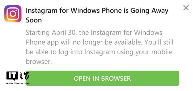 “从4月30日开始,Windows 10 Mobile的Instagram应用程序将不再可用。你仍然可以使用移动浏览器登录Instagram。”通知显示。