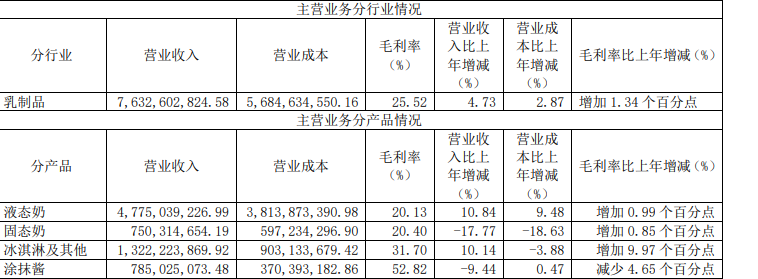 从业务层面来看,虽然三元股份是一家偏向于区域性乳企,但业务结构却相对完整,几乎覆盖了冰淇淋、巴氏鲜奶、酸奶、奶粉和涂抹酱等诸多领域。不过具体来看,现在的三元股份的营收主力似乎集中在两方面:一是冰淇淋业务;二是液态奶业务。