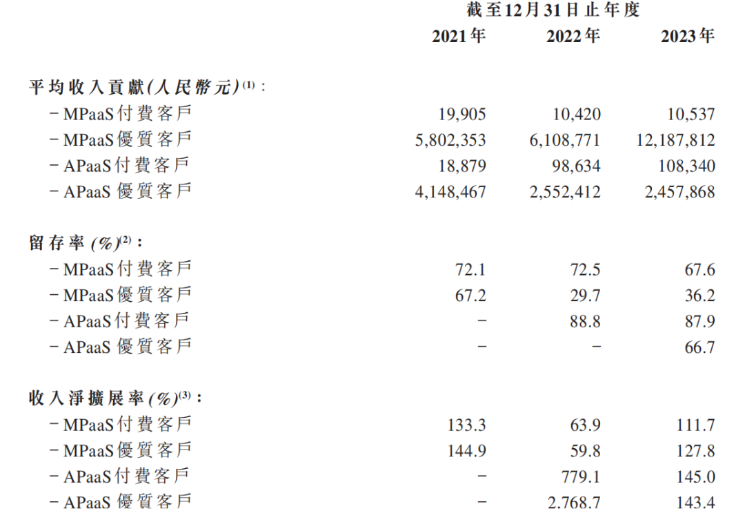 MPaaS付费客户的平均收入贡献在2022年大幅下滑47.65%,2023年仅恢复增长1.12%,各业务付费客户留存率均有所降低。