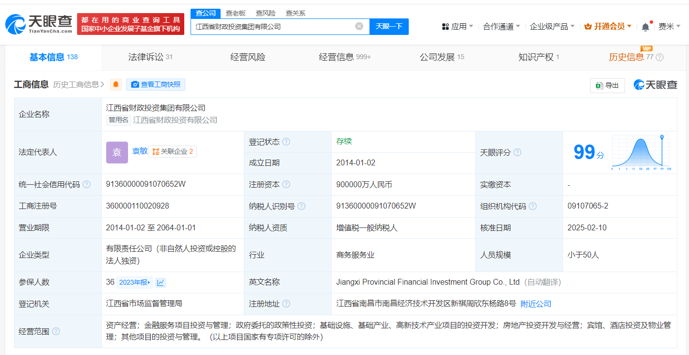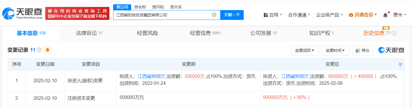 天眼查App显示,近日,江西省财政投资集团有限公司发生工商变更,注册资本由50亿人民币增至90亿人民币,增幅80%。