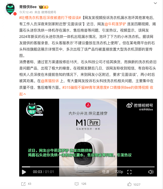据中青网旗下短视频媒体“青蜂侠Bee”报道,近日,网友@牛莉莲梦驴连发四期视频,揭露石头迷你洗烘一体机存在漏水、售后拖沓等问题,引发热议。