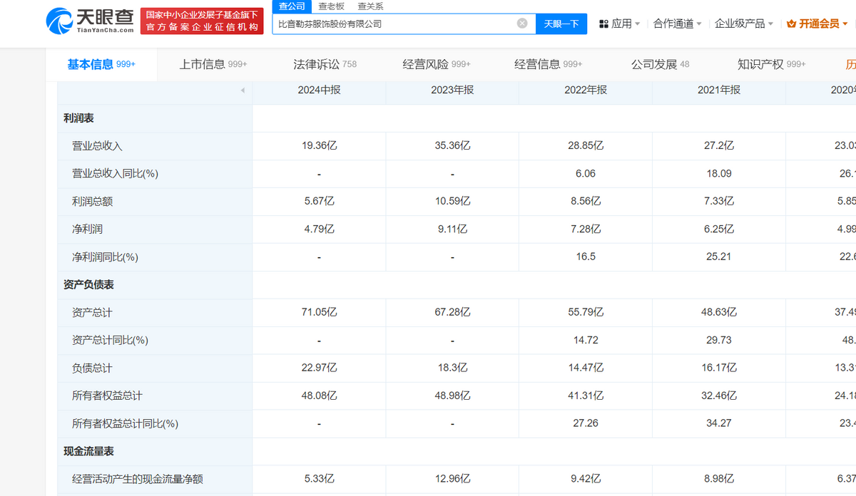 又比如,天眼查APP显示:比音勒芬对应的毛利率为76.42%,不仅较去年同期几乎没有下滑,而且整体仍高于报喜鸟们。这说明其可能没有选择降价换增长的套路,品牌高端化也就没有受到太大影响。