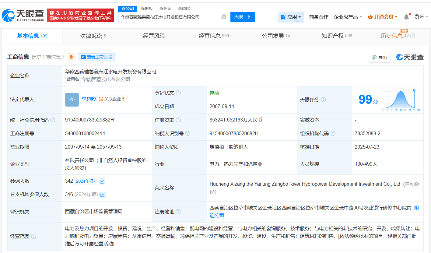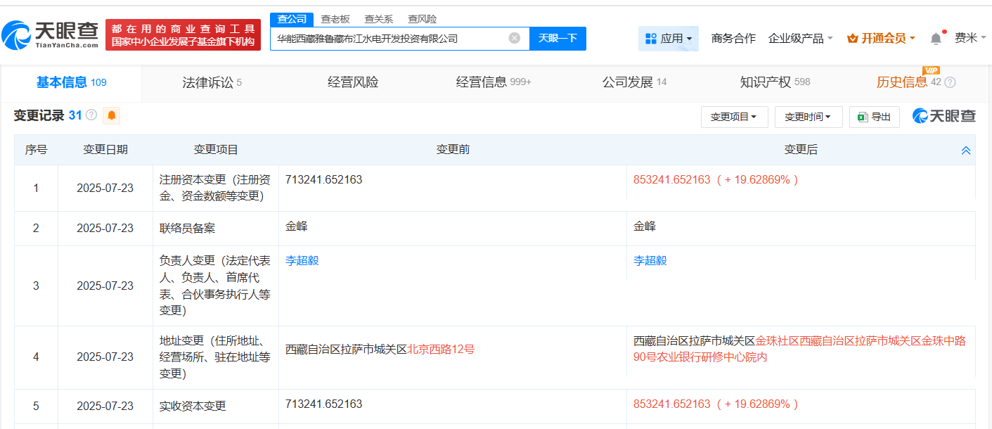 天眼查App显示,近日,华能西藏雅鲁藏布江水电开发投资有限公司发生工商变更,注册资本由约71.3亿人民币增至约85.3亿人民币,增幅约20%。